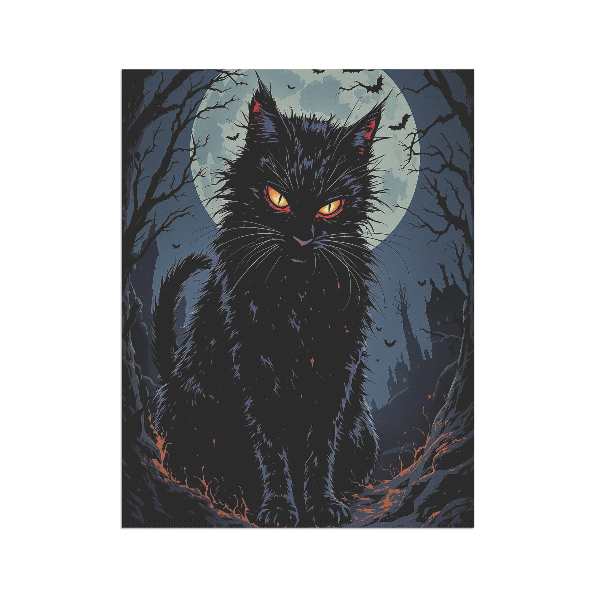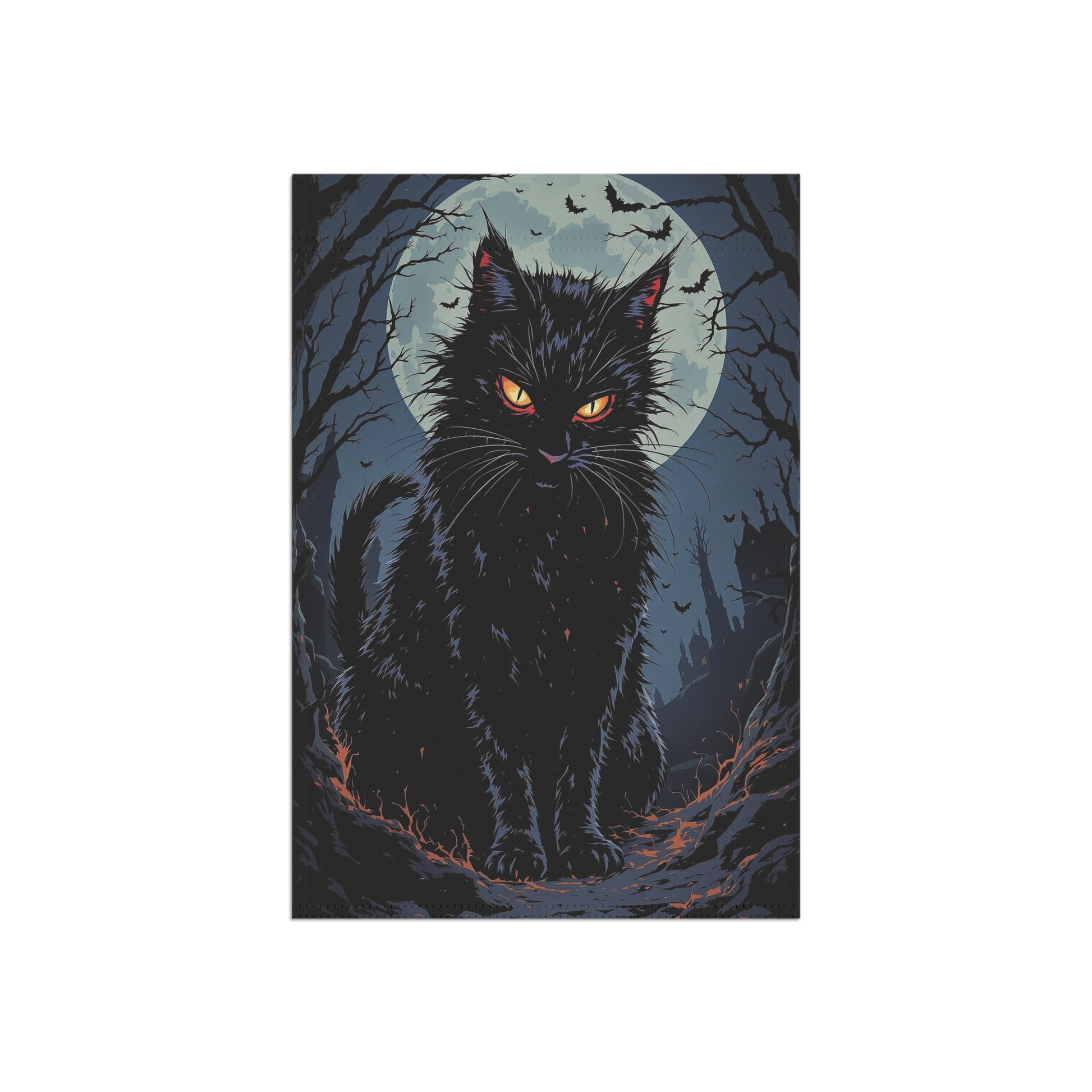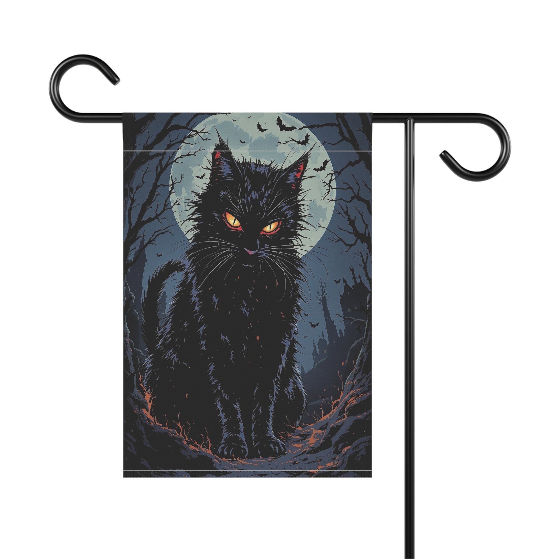 Vibrant Andy Warhol style Halloween cat garden banner, perfect for adding a pop of color and whimsy to your outdoor space. Ideal for Halloween decorations and cat lovers looking to showcase their unique style.