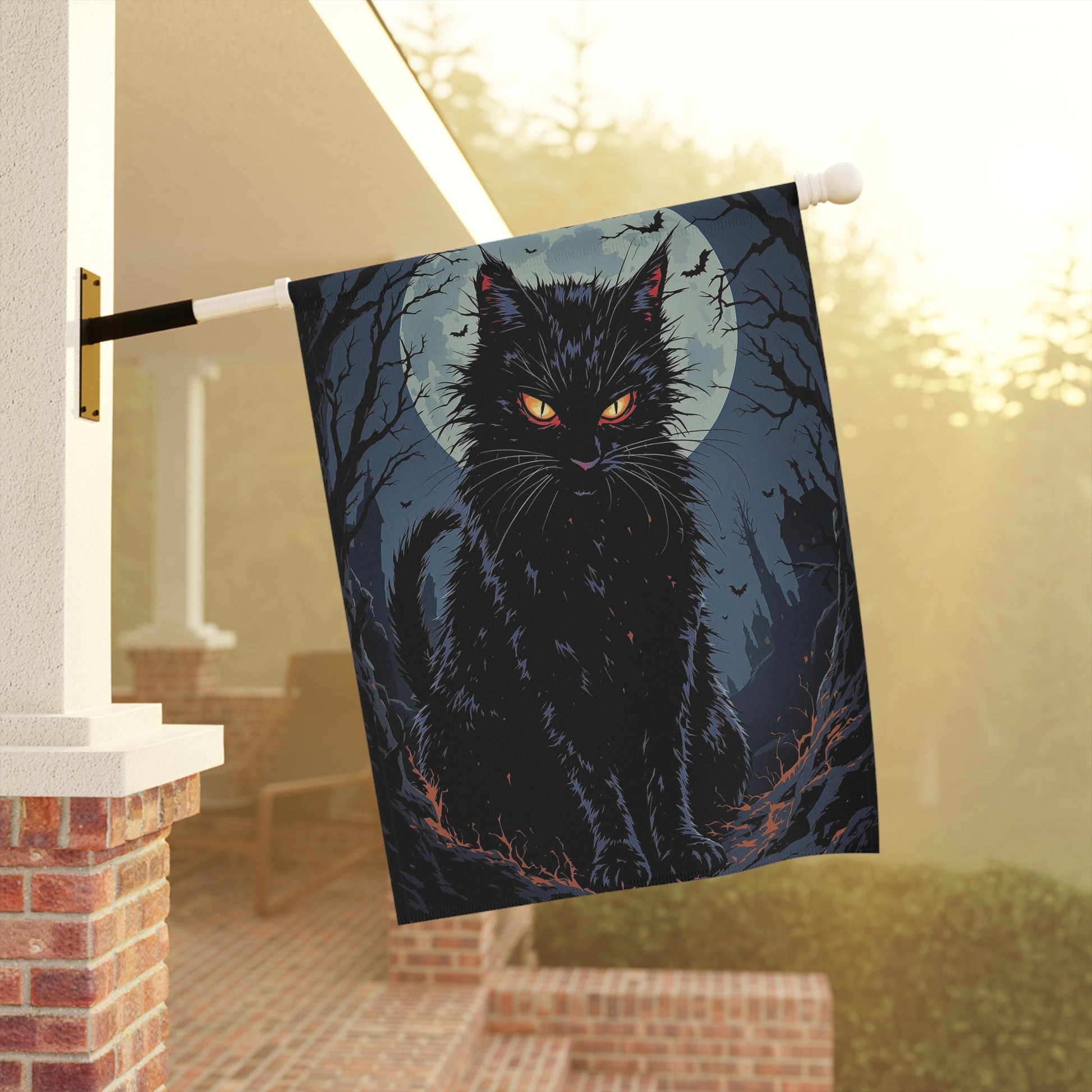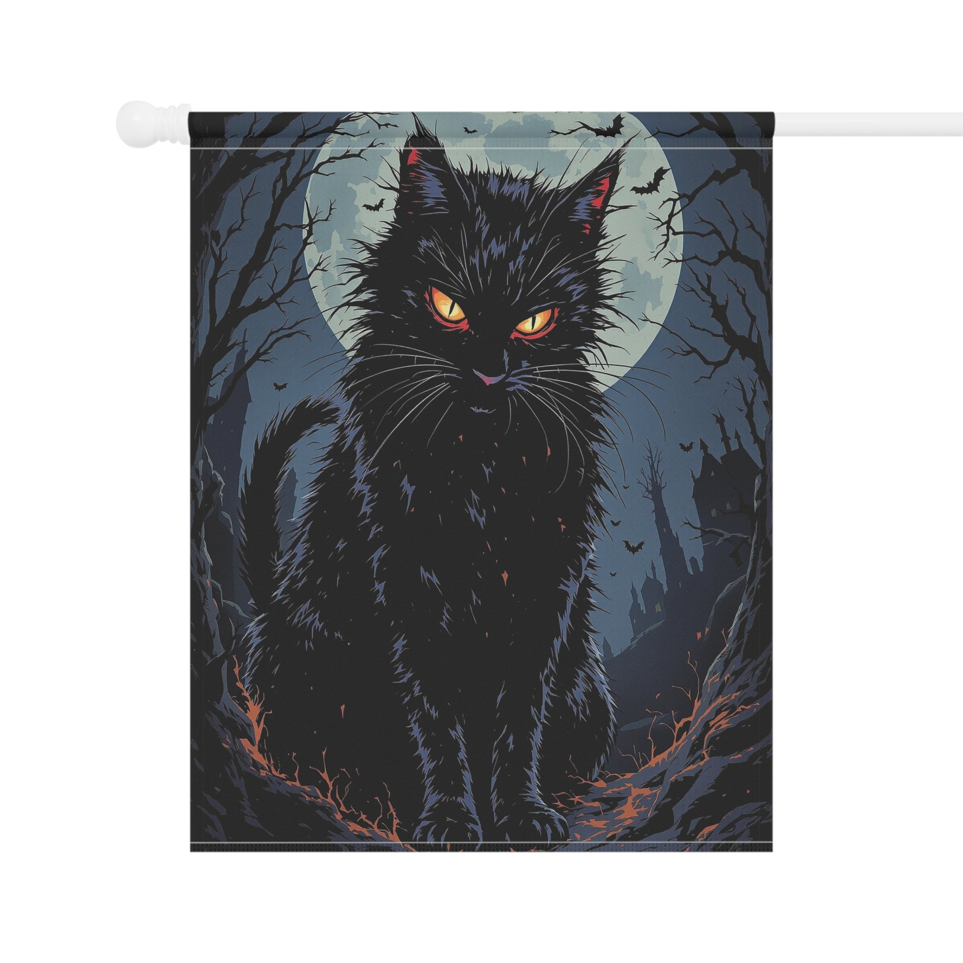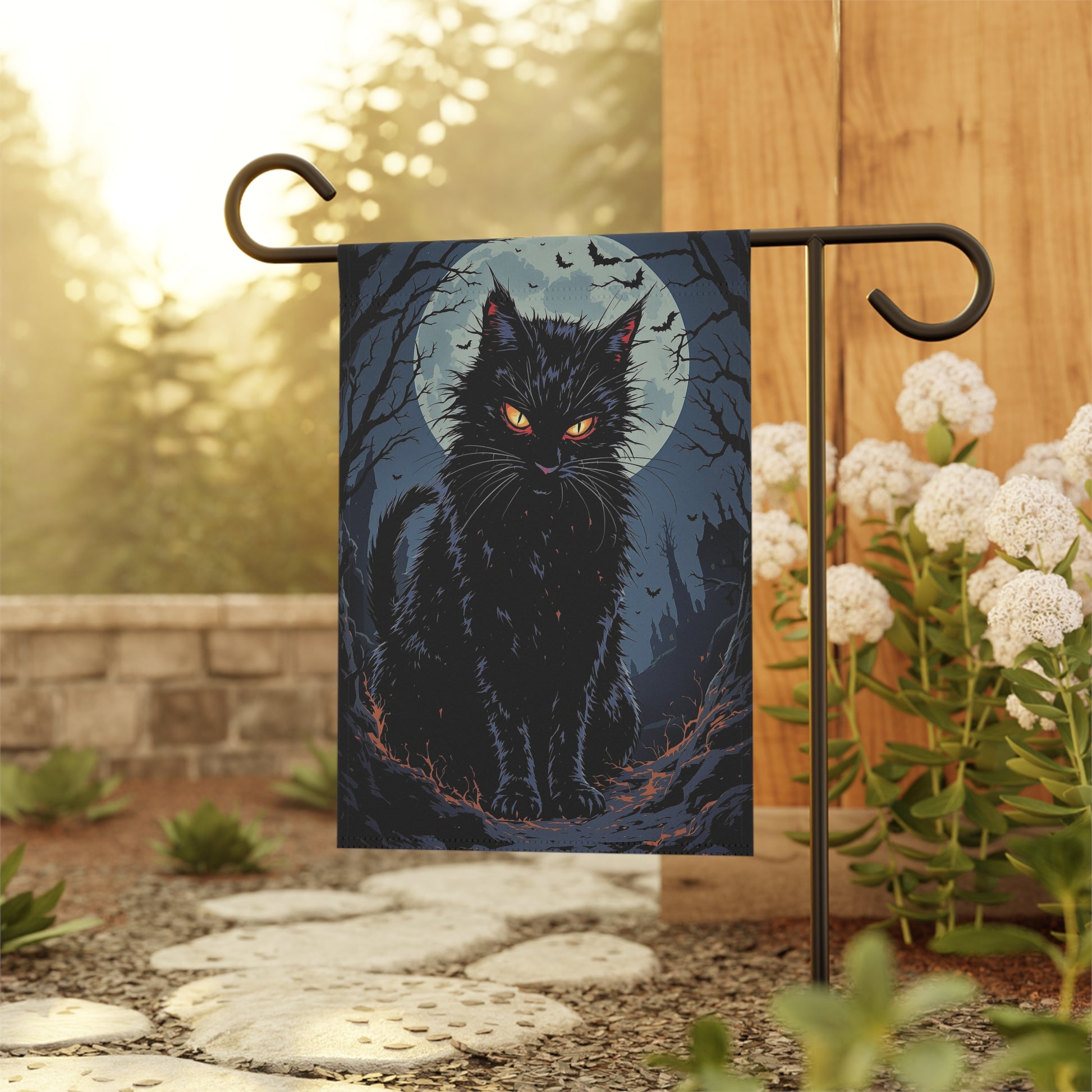 Vibrant Andy Warhol style Halloween cat garden banner, perfect for adding a pop of color and whimsy to your outdoor space. Ideal for Halloween decorations and cat lovers looking to showcase their unique style.