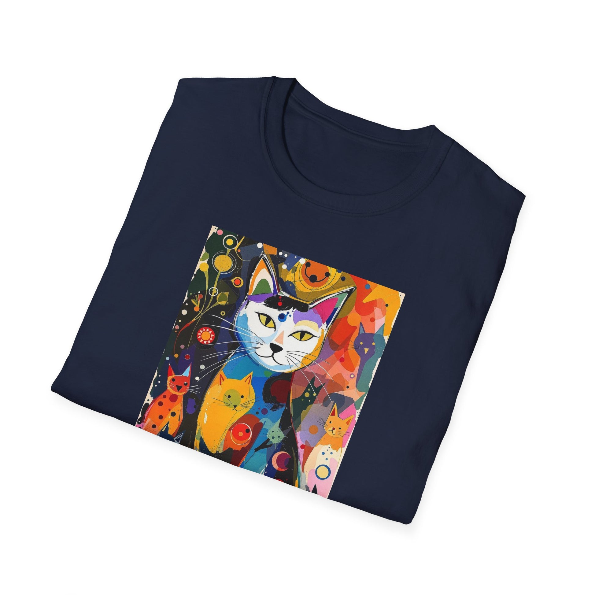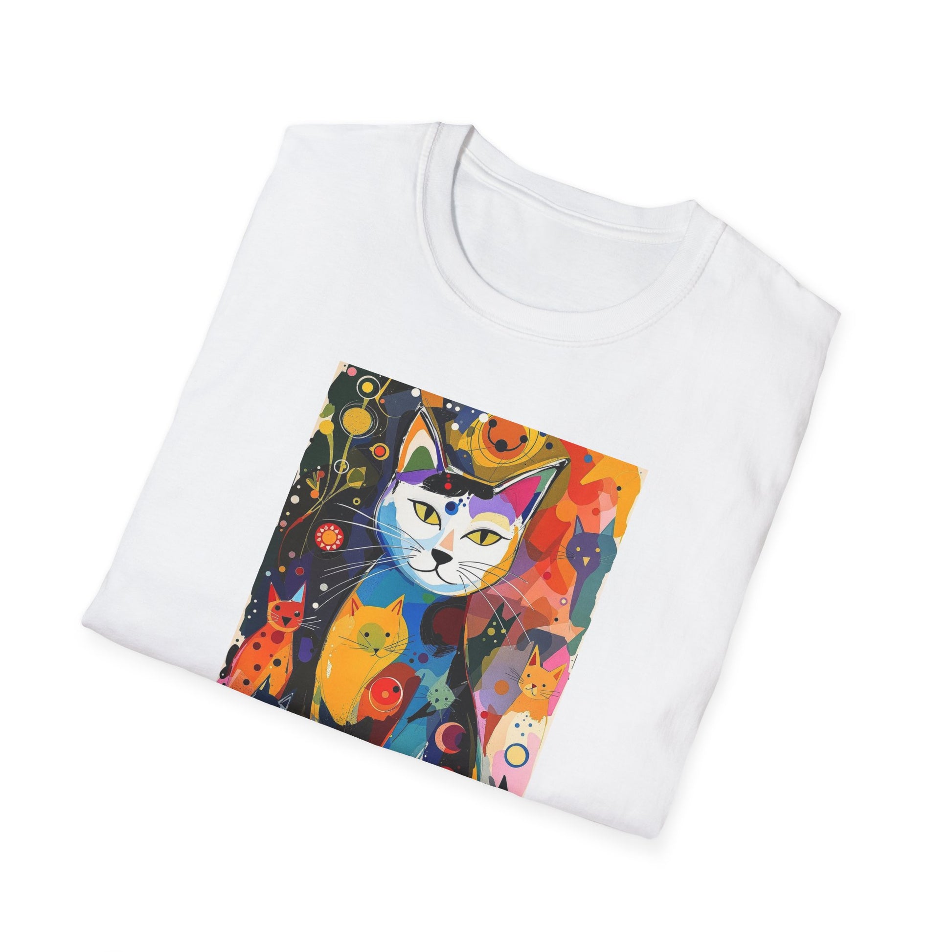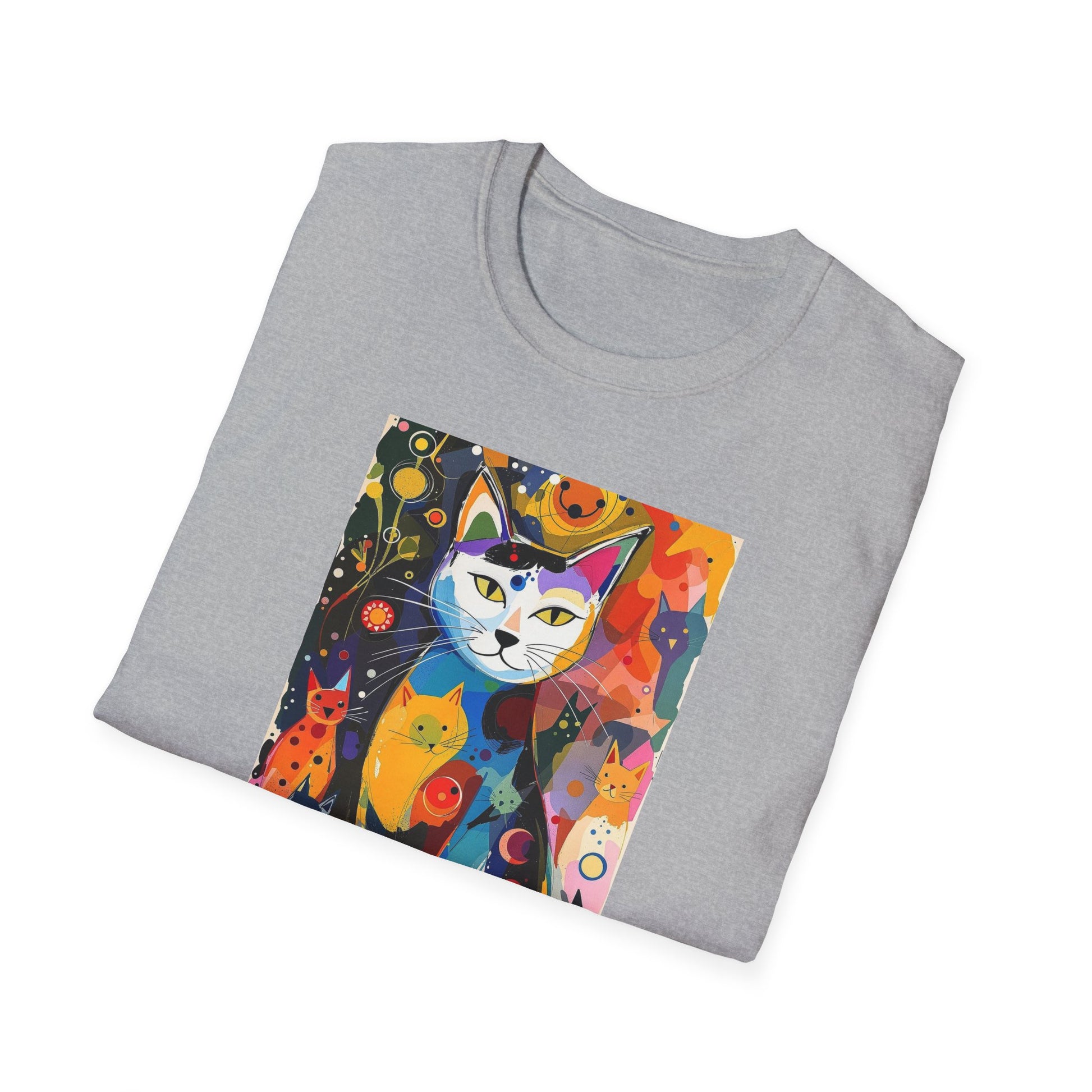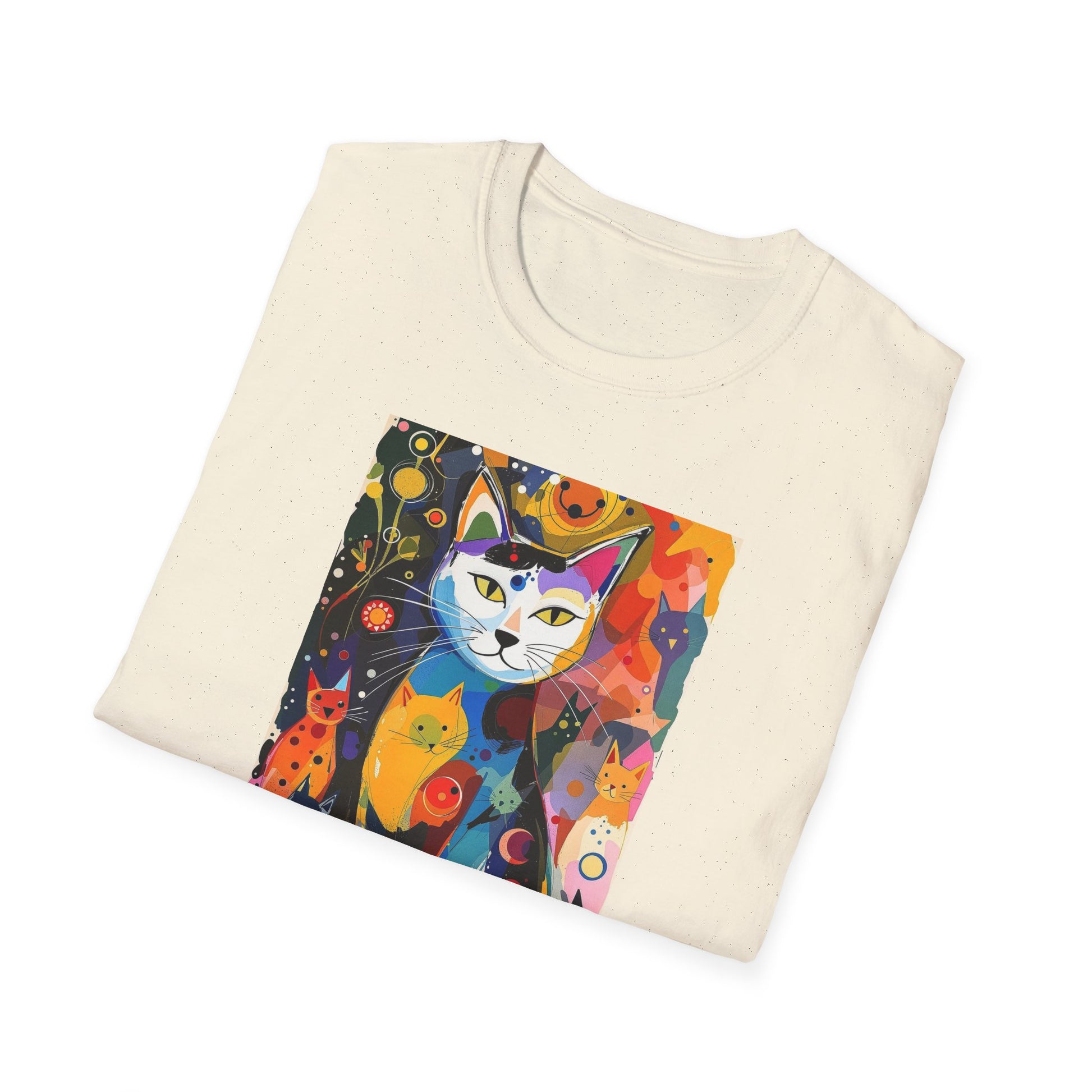 Modern art cat print design T-shirt for cat-lovers, perfect for adding a touch of whimsy to your casual outfits. This unisex T-shirt is made from durable and smooth fabric, ideal for everyday wear. A versatile style that can be dressed up or down for any occasion.