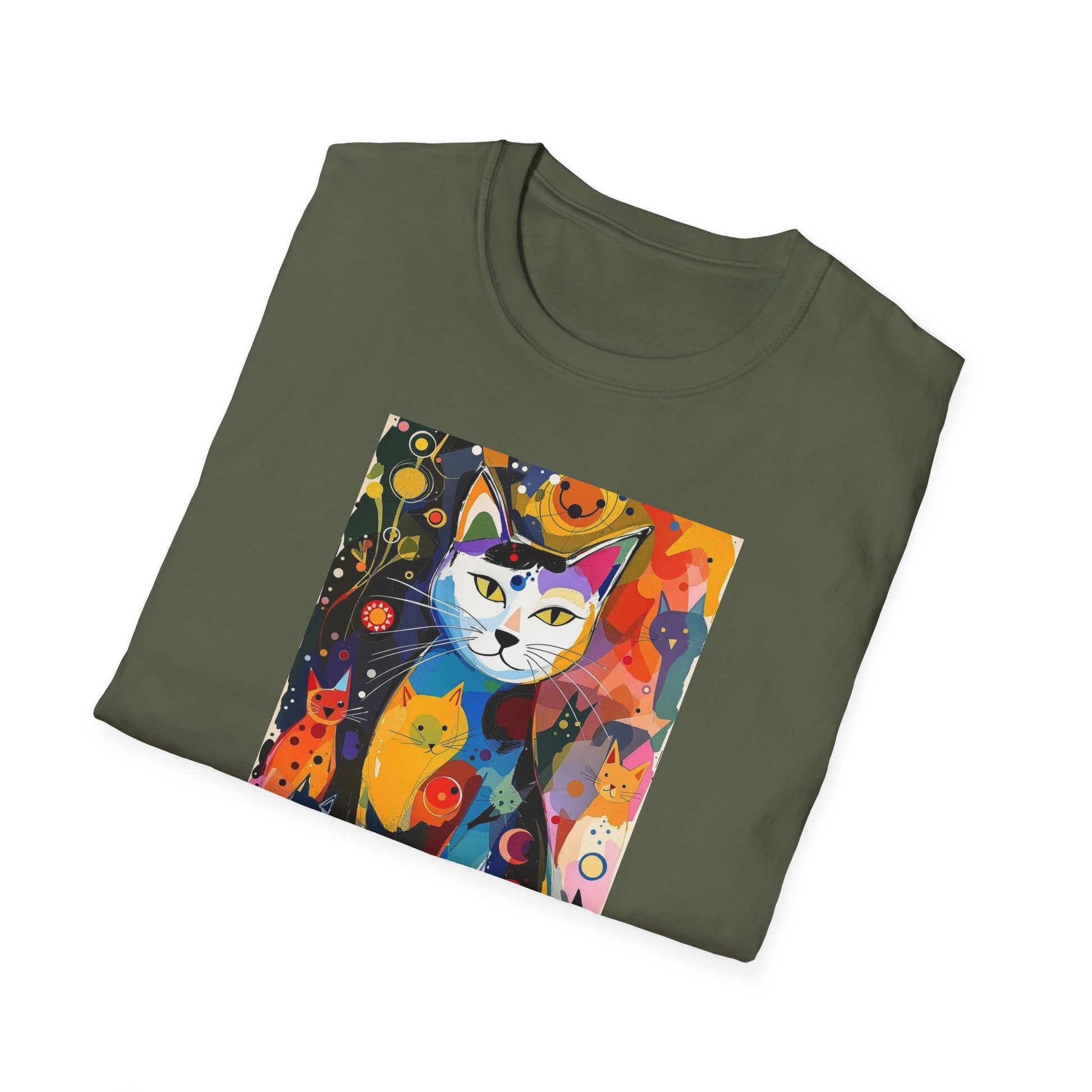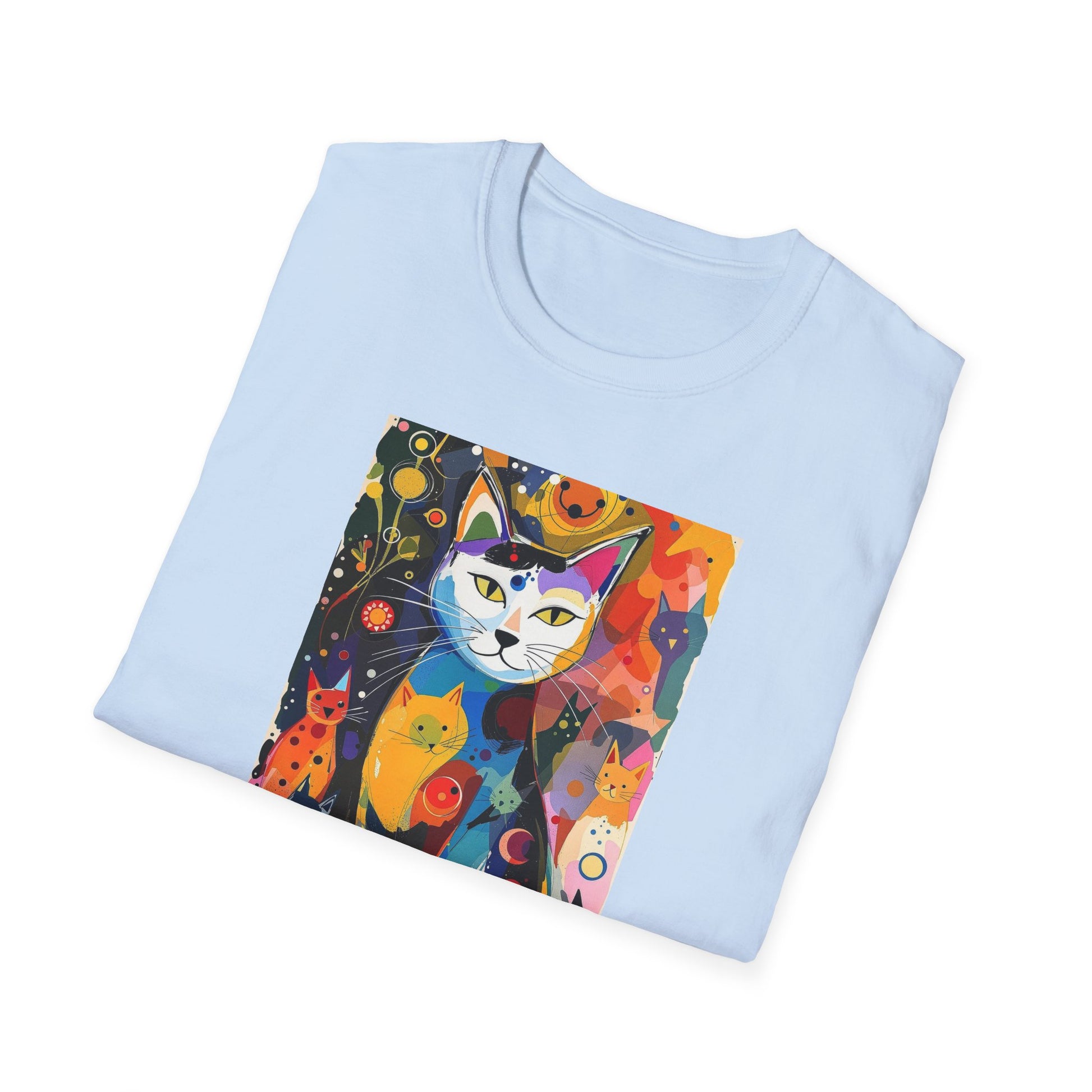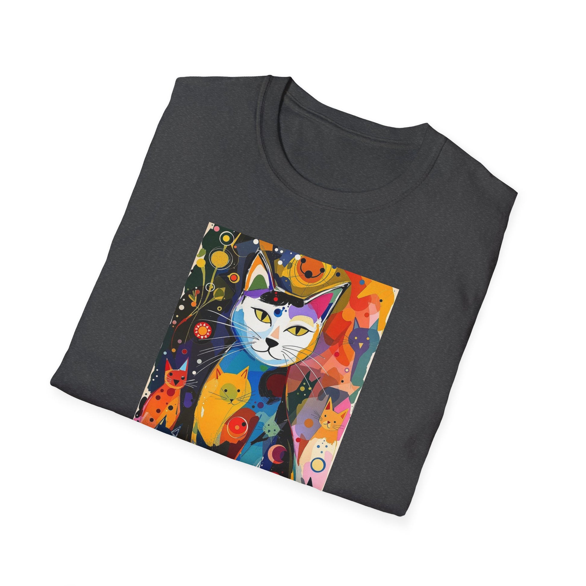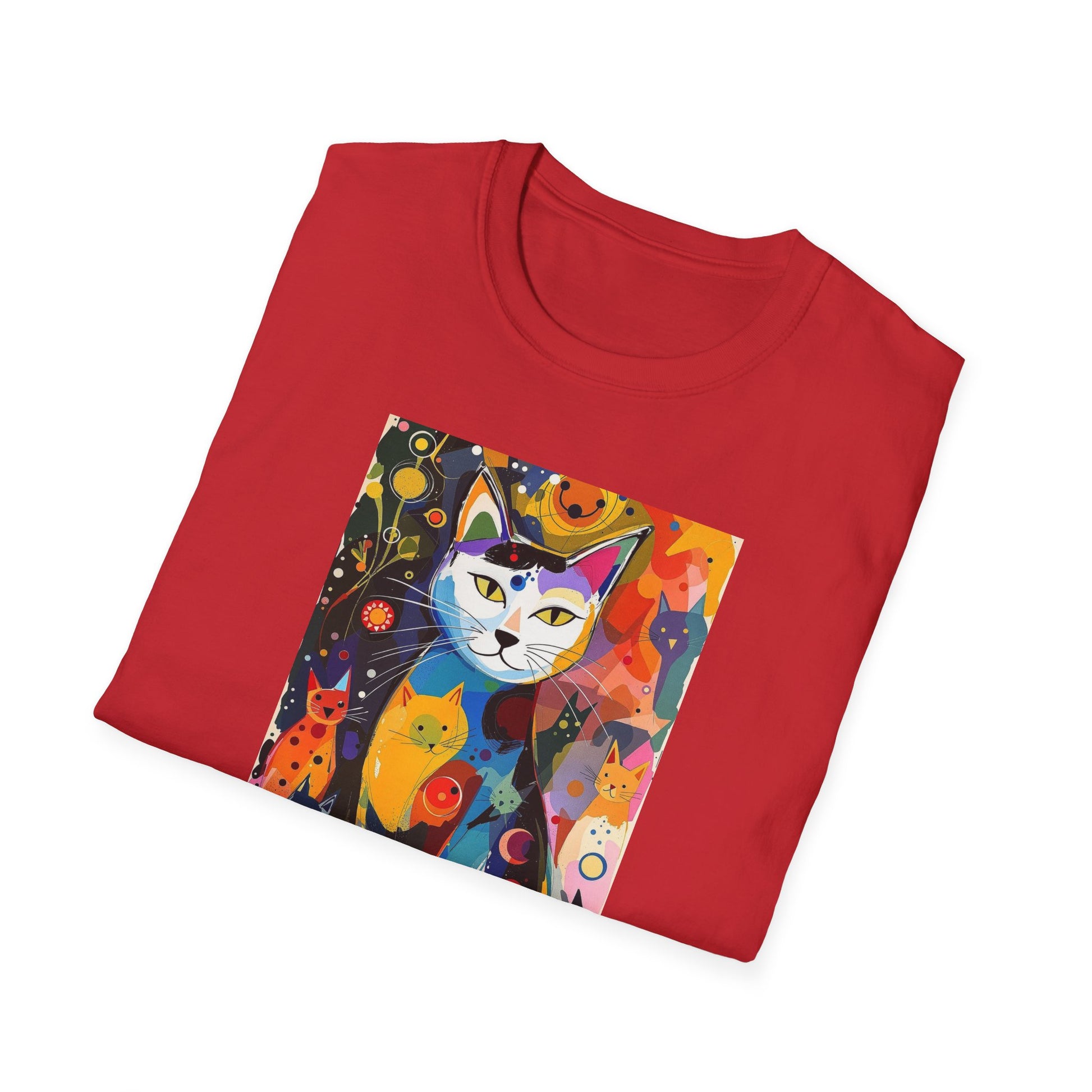 Modern art cat print design T-shirt for cat-lovers, perfect for adding a touch of whimsy to your casual outfits. This unisex T-shirt is made from durable and smooth fabric, ideal for everyday wear. A versatile style that can be dressed up or down for any occasion.