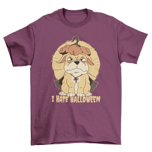 Awesome t-shirt design that features an illustration of a dog wearing a pumpkin hat and the quote "I hate Halloween"